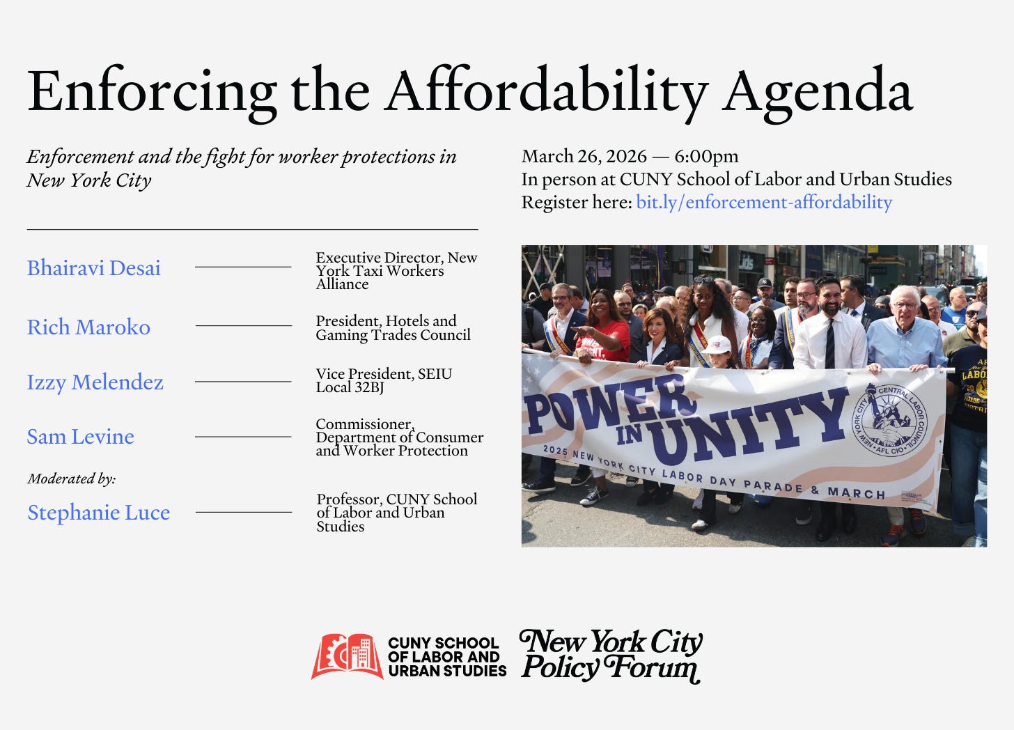 Join the CUNY School of Labor and Urban Studies and the New York City Policy Forum on March 26 at 6pm for an in-person discussion on enforcement and worker power in NYC.