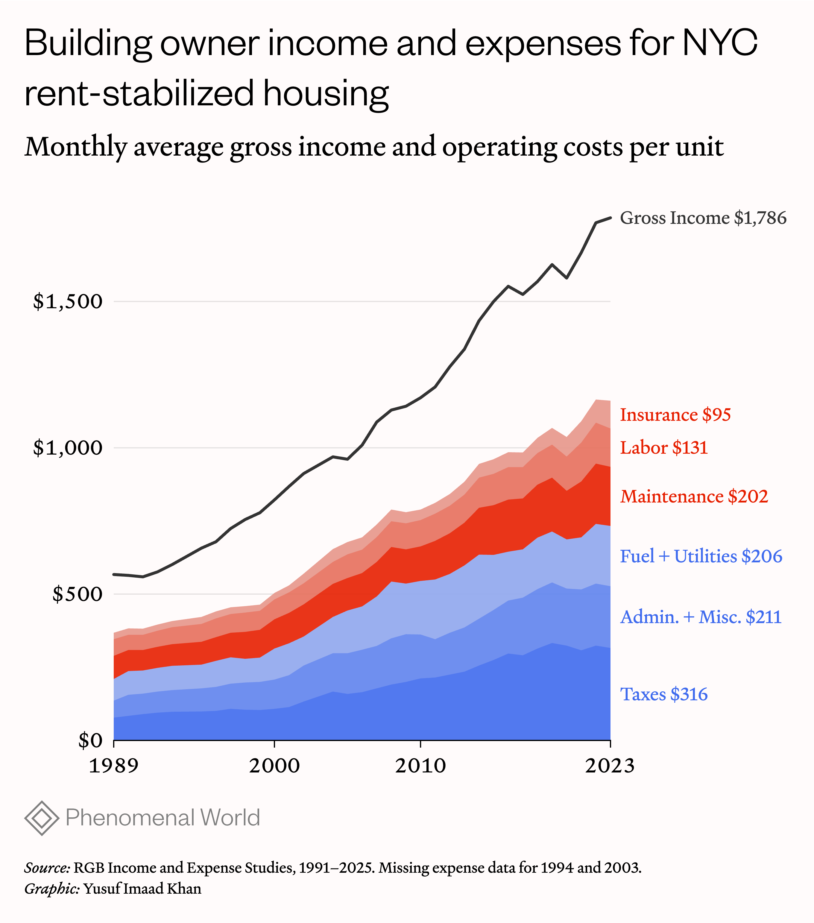 There is plenty of data on the incomes and expenses of residential buildings in the city, in particular the detailed (though not always complete) records of the New York City Department of Finance (DOF). Research and advocacy organizations like the Furman Center and the Community Service Society regularly put out useful reports based on this. For present purposes, the RGB’s annual Income and Expense Study, based on the DOF data, is enough to give the broad picture.